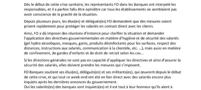 Toutes les réponses à vos questions en cliquant sur le lien suivant : https://www.force-ouvriere.fr/coronavirus-fo-vous-repond Si besoin vous pouvez toujours nous joindre via contact@fosg.net.
